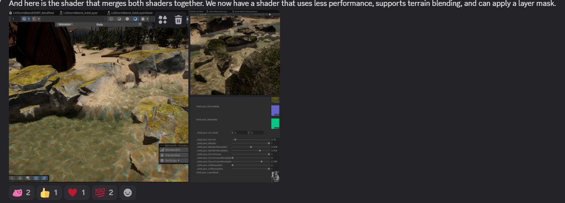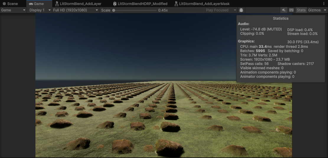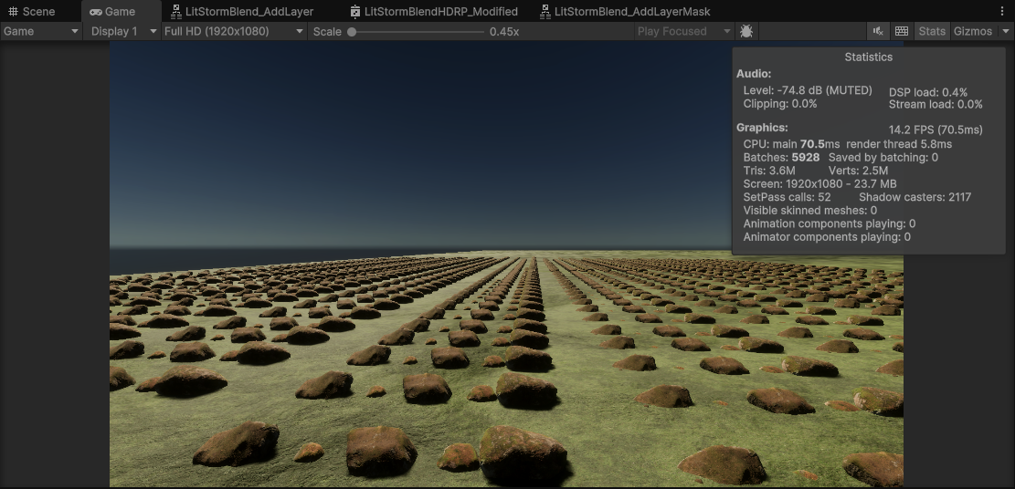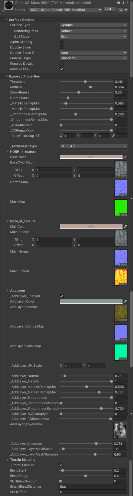 Shader Merging (HLSL/Graph): Manually merged Storm’s Texture-Based Blending logic into the project’s original Boxophobic and HDRP/Lit Shaders. This enabled a “one-click switch” compatibility, allowing art assets to seamlessly blend with terrain textures while preserving their original high-fidelity details.
